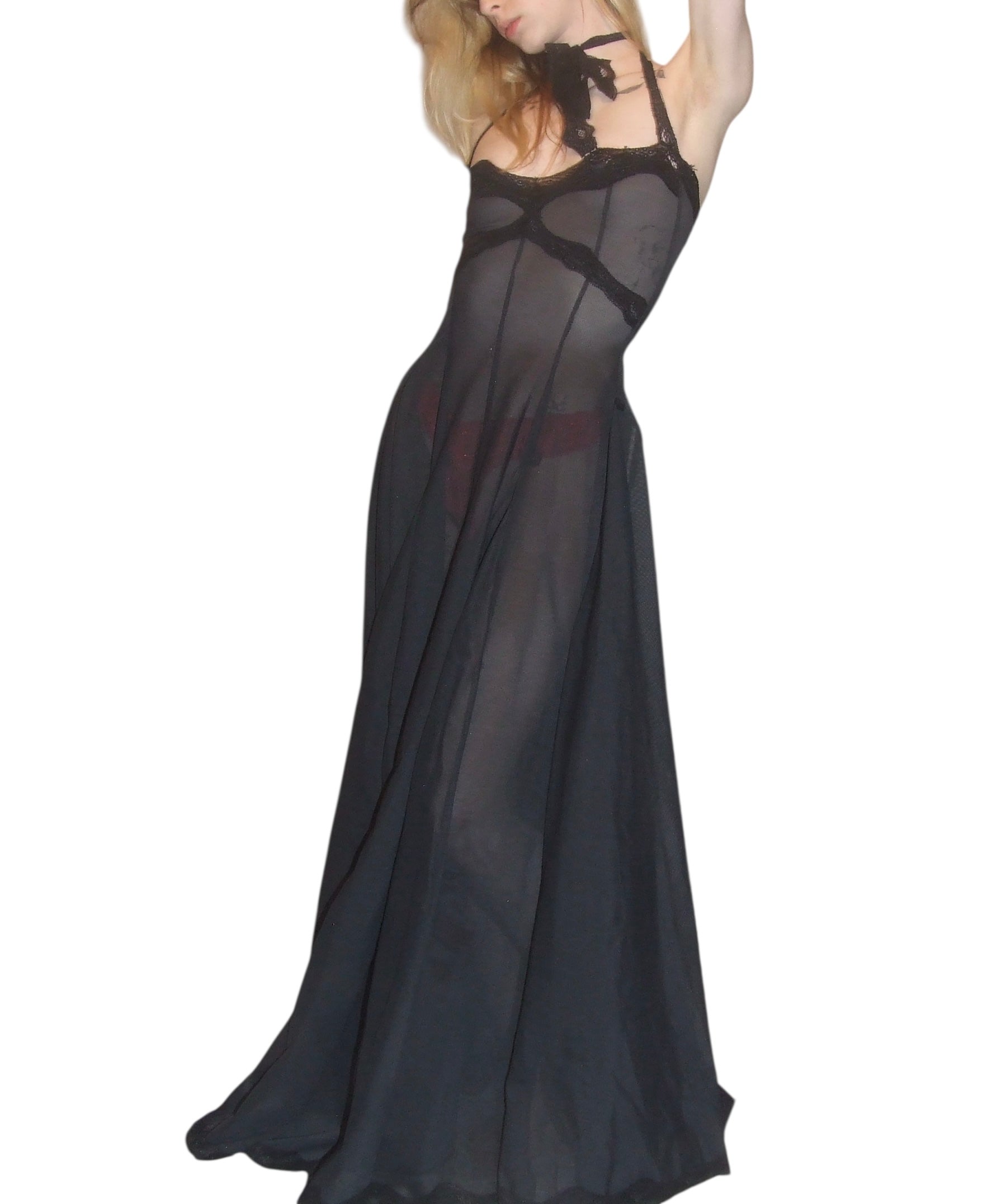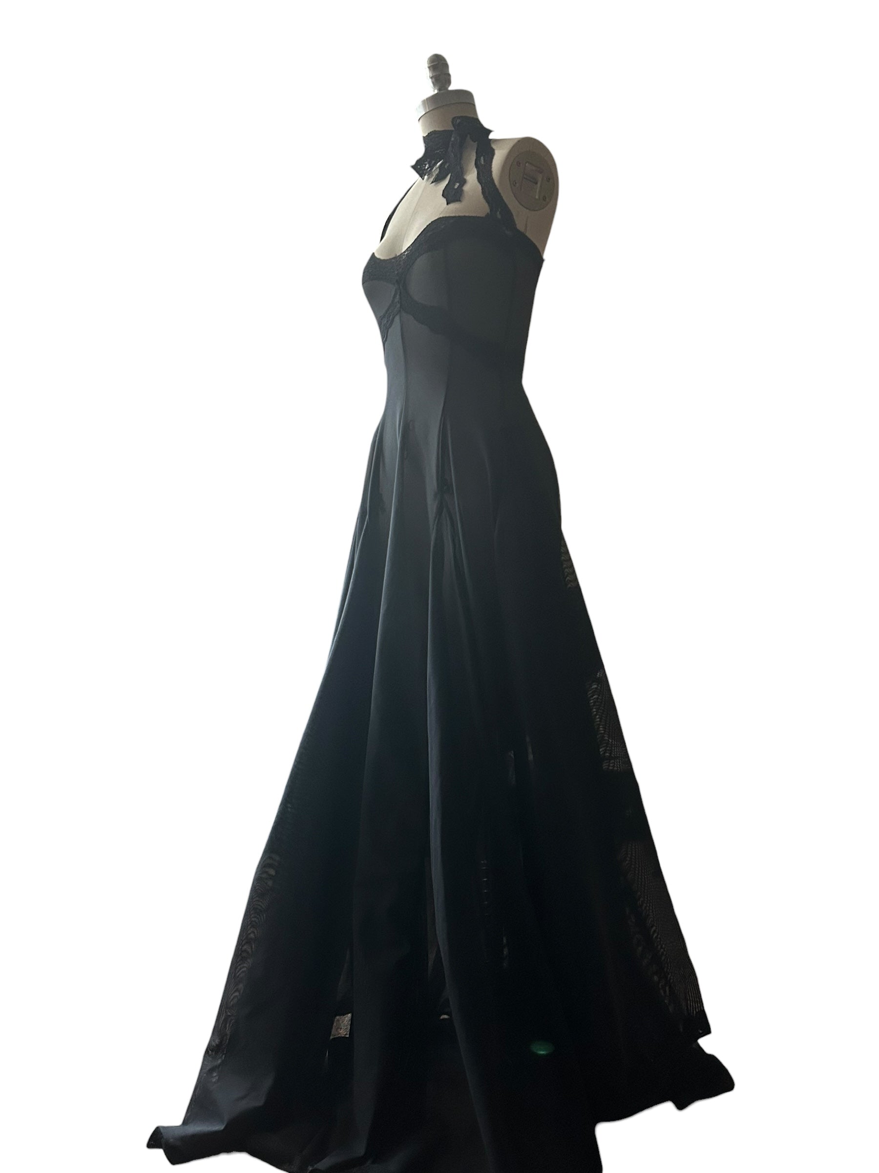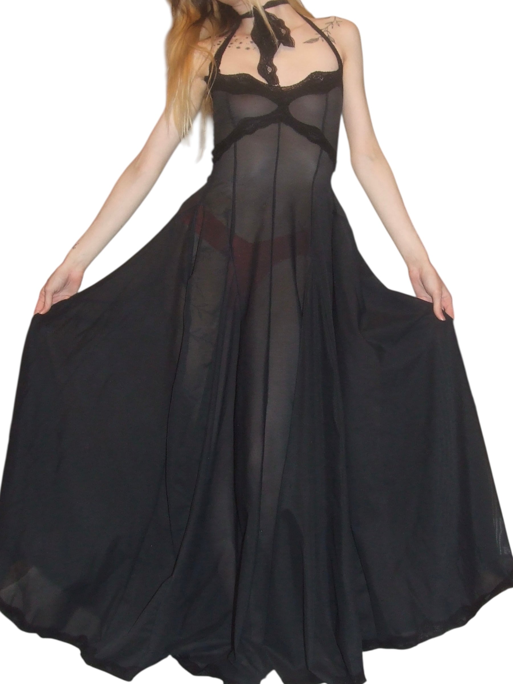 handmade to order semi sheer a-line dress made with deadstock power mesh and vintage nylon lace